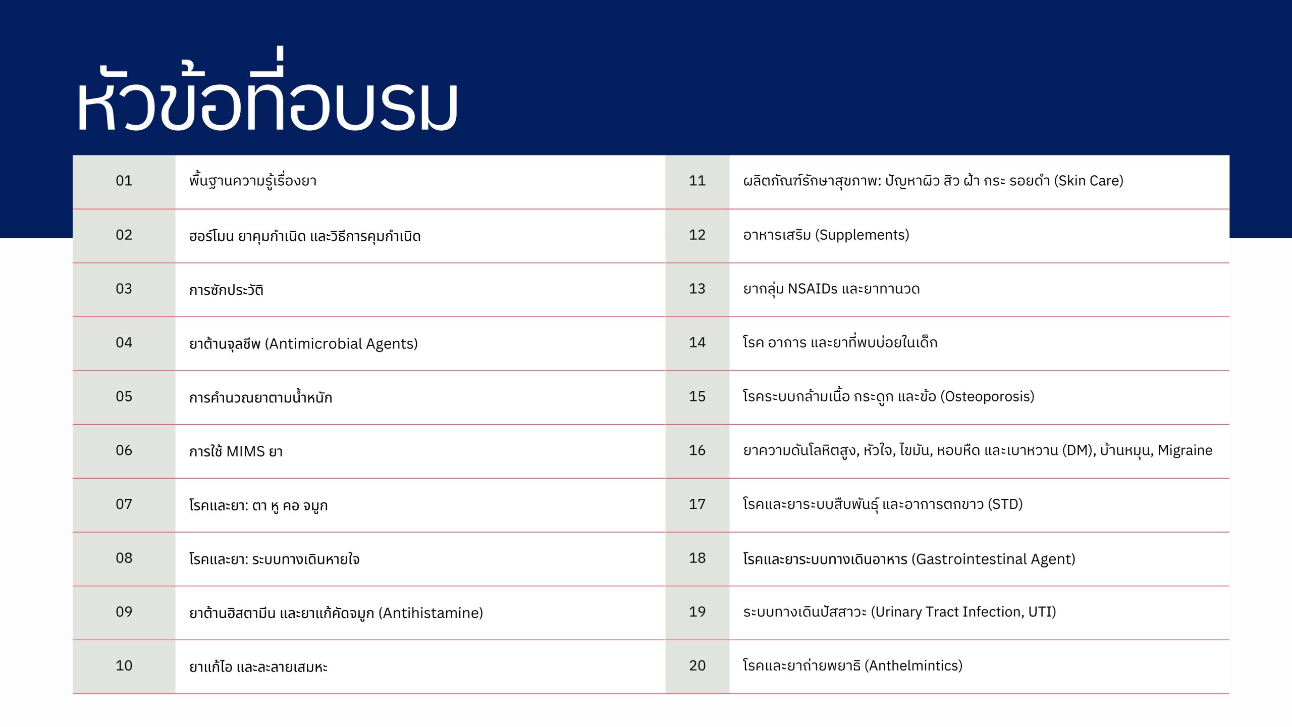 อยากมีความรู้เรื่องยา ทำงานบริษัทยา ต้องมีความรู้เรื่องยาจำเป็นในร้าน กลุ่มเล็ก เน้นถามตอบ ปูพื้นฐานจากศูนย์ เนื้อหาครอบคลุมคอร์สบุคลากรร้านขายยา สำหรับผู้ช่วยเภสัช