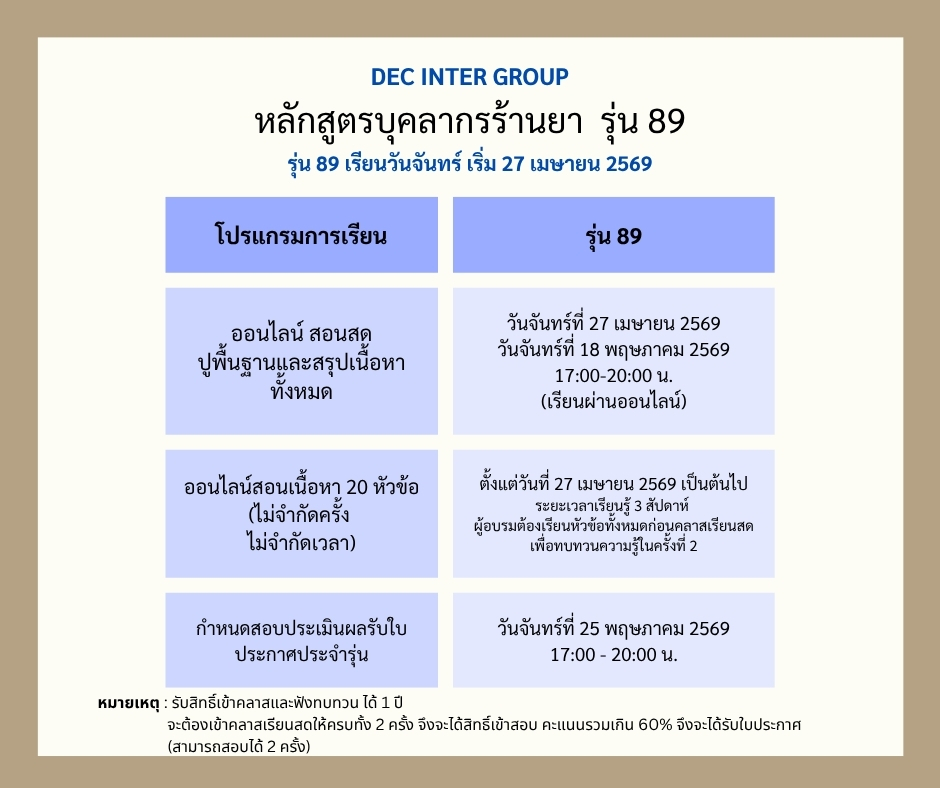 - วุฒิระดับปริญญาตรี ขึ้นไป หรือ วุฒิ ม.6 ที่มีประสบการณ์ร้านยามากกว่า 1 ปี